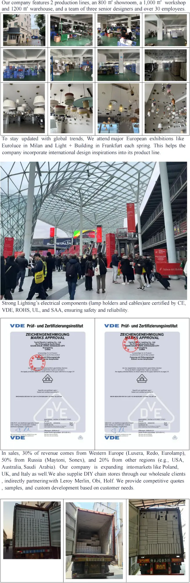 Büszkén szolgáltunk ki olyan nemzetközi neveket, mint a Leroy Merlin és az OBI, ezzel hírnevet építve kitűnő dizájnnal, tartós minőséggel és időben történő szállítással. A Strong Lighting 2015 óta elkötelezett a személyes stílust tükröző világítási megoldások megalkotásában. Több mint 3000 termékpalettánk a klasszikustól a kortársig terjed, keverve olyan anyagokat, mint az üveg, fém és kristály, hogy innovatív, funkcionális darabokat készítsünk.