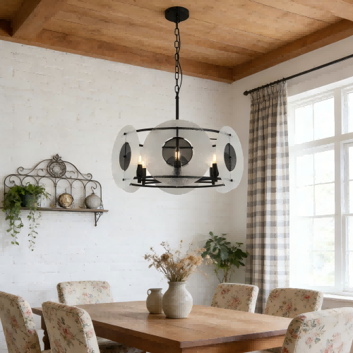 A robusztus matt fekete vaskerettel készült matt fekete üvegcsillár kör alakú cukorüveg árnyalatokkal és méhsejt fémhálóval rendelkezik, amely feltűnő réteges esztétikát teremt, ahol a fény lágyan diffundál át a texturált üvegen, míg a háló ipari élt ad.